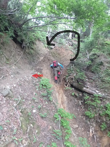 で、↓ここまで登ったらロープの道へ一瞬トラバースするんだけど(赤矢印)
