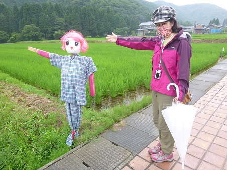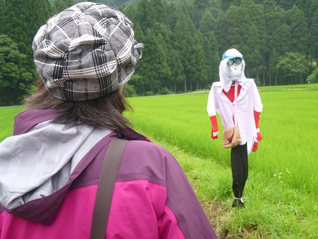各たんぼに一つ〜二つずつ、個性的な案山子が飾られていた。