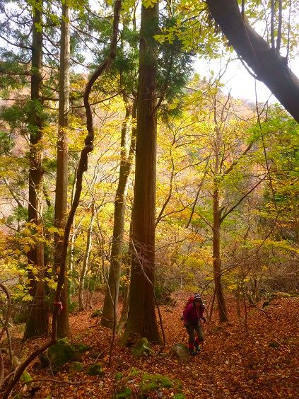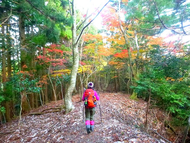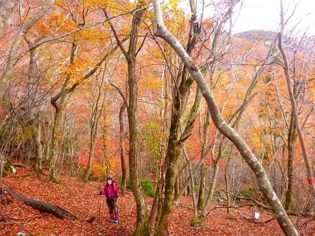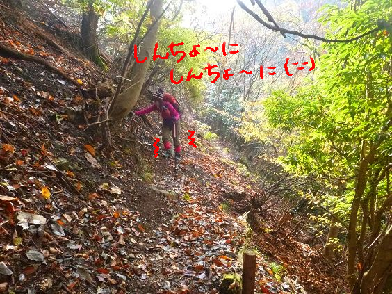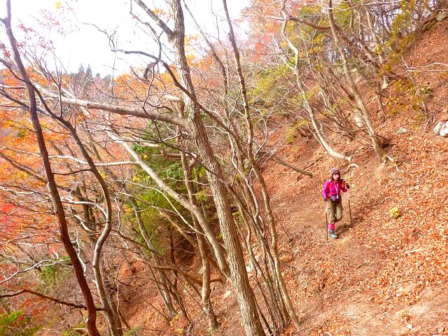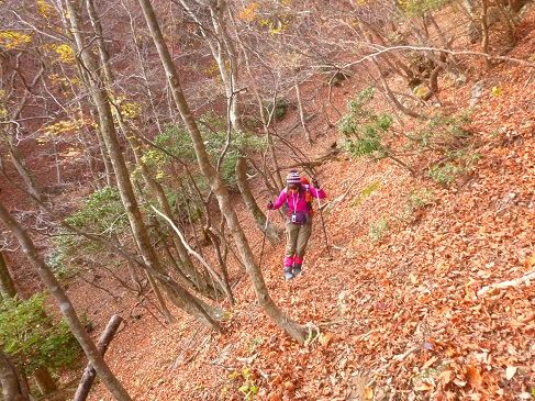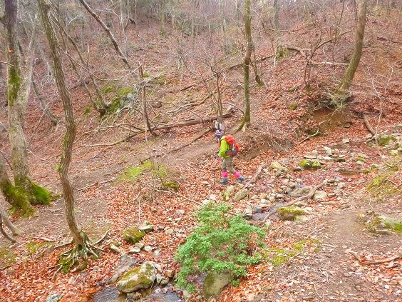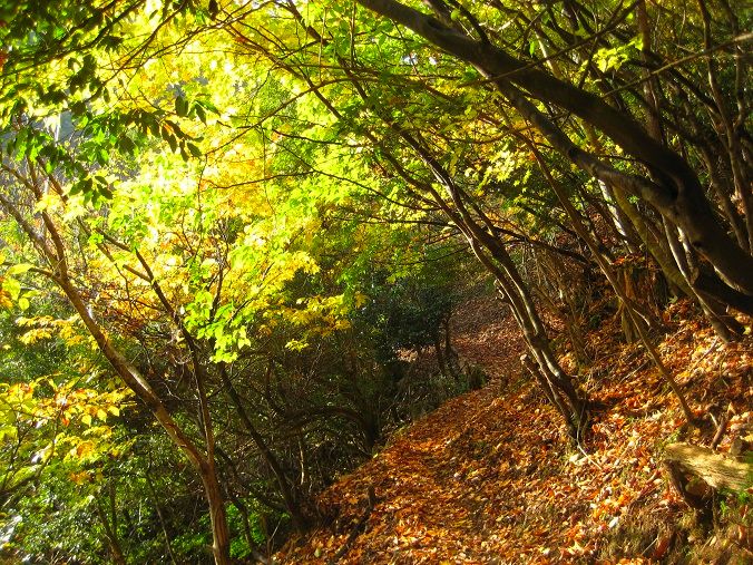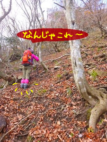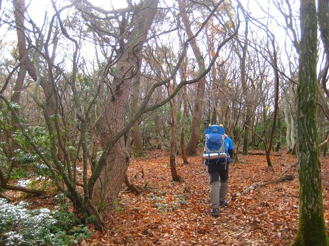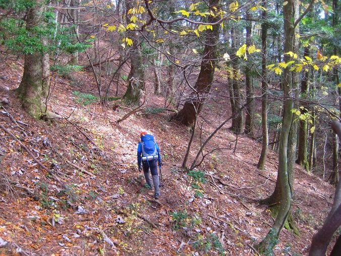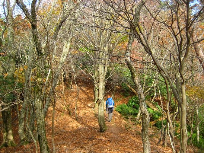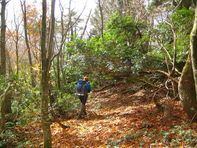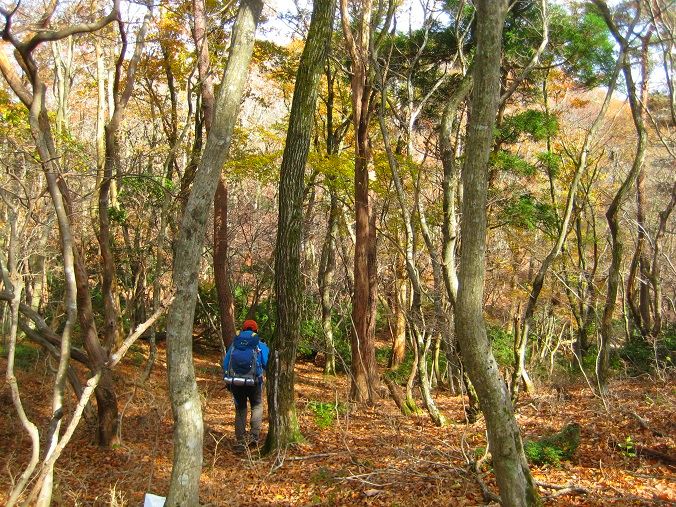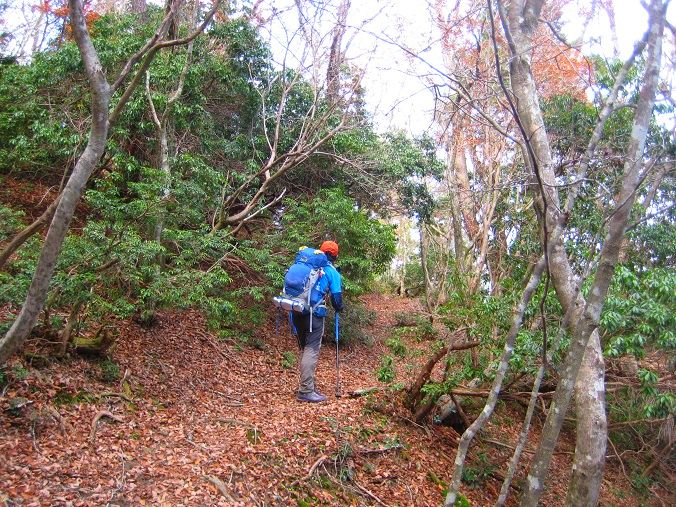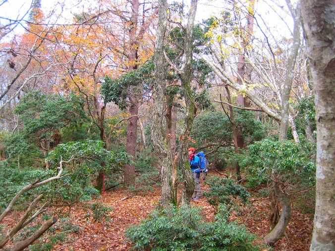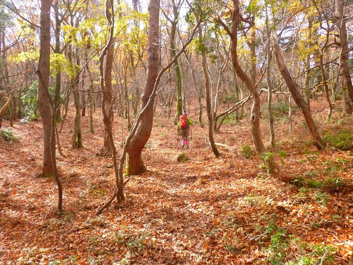 てっぺん直下は落ち葉だらけの踏み跡薄い樹林帯で
