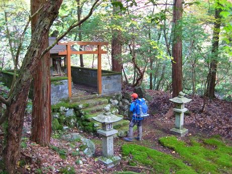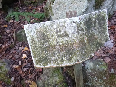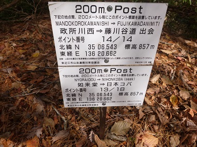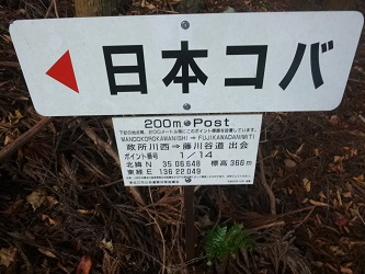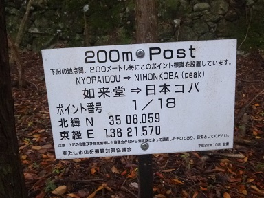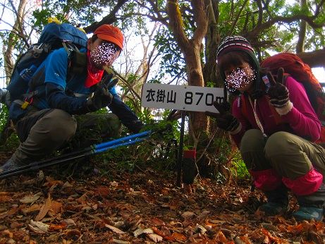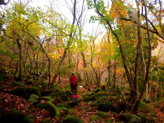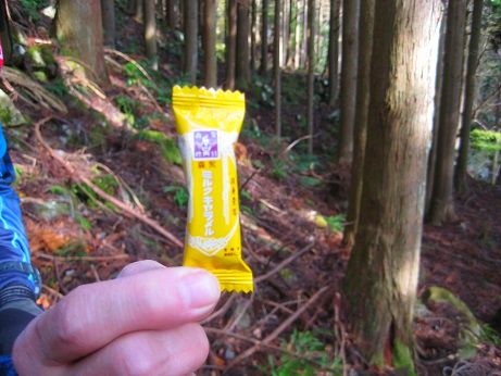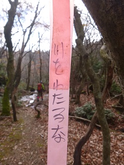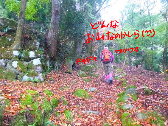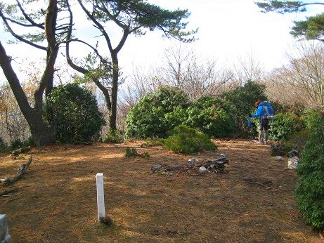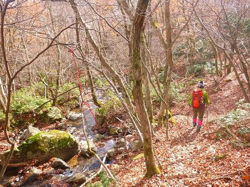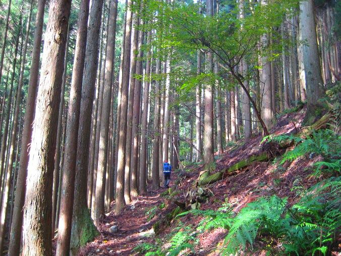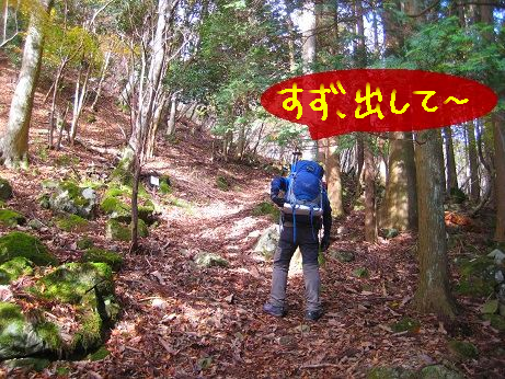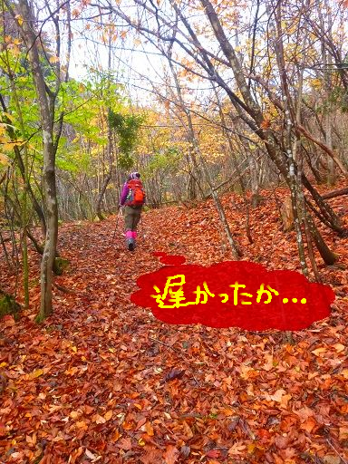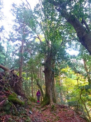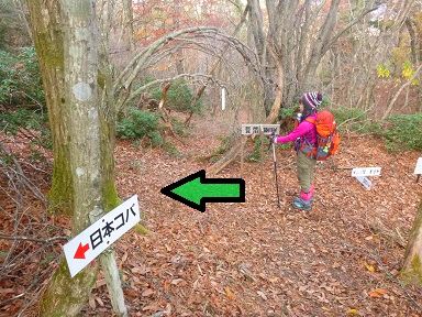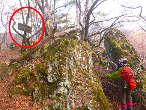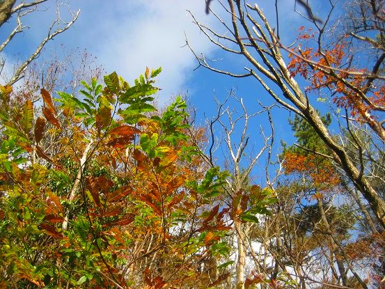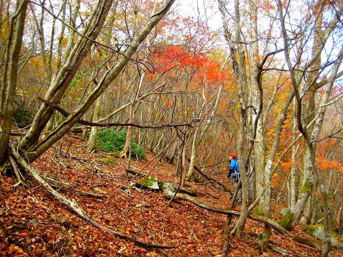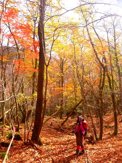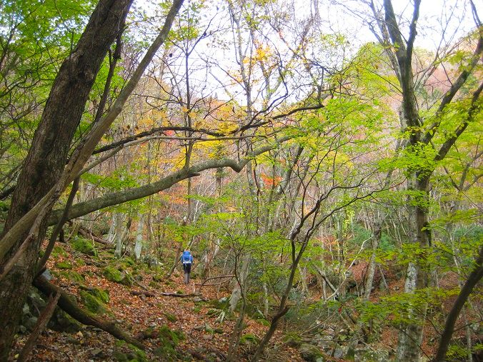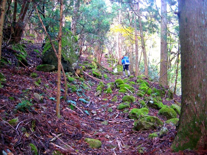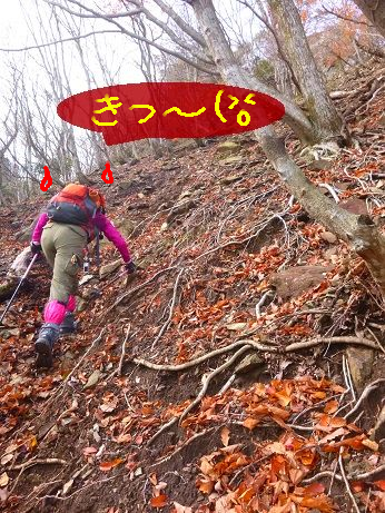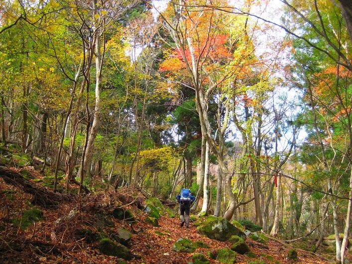 てっぺん直下は落ち葉だらけの踏み跡薄い樹林帯で